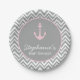 Grey and white chevron pattern with pastel pink nautical anchor baby shower paper plates. The design features a grey and white chevron pattern and a pastel pink nautical anchor. Customize with your text.