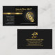 An exquisite grey and black layered design is accentuated by a faux gold stripe near the top of the card. Riding this gold stripe of success lies your prestigious name and the job title (in faux gold) with a gold "bulb and sprocket" motif just underneath. At the grey column, card details are located near the white lines. Towards the lower right corner, is a slogan caption option for you to publicize your services.