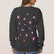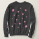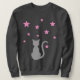 A silhouette cartoon of a grey cat with pink eyes. A pink star hangs from the cat's tail. A starry sky of matching stars is on the front and back.