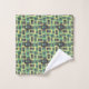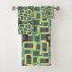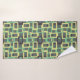 This towel set has a mid-century modern design of rounded rectangles with ovals inside in retro shades of dark grey, pale yellow, and seafoam on a field of light grey. If you want the same design with different colors, message me.