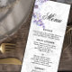This gorgeous wedding menu has a very elegant design of faint, grey and white damask in the background with a beautiful floral arrangement in purple with berries and flowers at the top left corner.