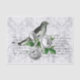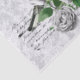 A pretty collage of a bird, white roses and script over a grey damask background.