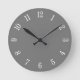 A wall clock with a grey background and large white numbers facing outward you can customize this clock to add your custom text, change background colors and more.
