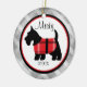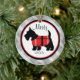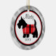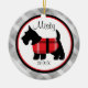 Cherish your pet by putting him or her on your Christmas tree! This Christmas ornament has a grey gingham, checkered background with a center circle outlined in red and black. There's a white center with a black Scottish terrier wearing a red plaid jacket. Personalize with name and/or year. Check out the many other designs we have in our store and other stores too: Kidsgalore and Skinsgalore