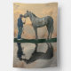 Grey Horse And Groom OTTB, House Flag. Digital Art. "The Turnout". Grey horse stands with his groom in an evening field at sunset. Design works for horse lovers, horse farms, racing, equine sports, and also thoroughbred aftercare. Fully customizable; make it your own.