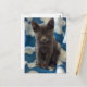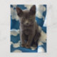 This grey kitten is sitting on a blue and white blanket, ready to make someone smile. Send this kitten postcard today!
