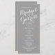 Modern text design in grey printed rack card wedding programs with white text.