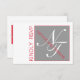 GREY, RED AND WHITE, TWO INITIALS INTERTWINED MODERN WEDDING RSVP. ELKE CLARKE© FOR MONOGRAM GALLERY. A PERFECT CHOICE FOR YOUR WEDDING INVITATION PACKET. SIMPLE LAYOUT, CLEAN LINES AND THE USE OF BOTH MODERN FONT AND FANCY SCRIPT FOR YOUR MONOGRAM LETTERS, GIVES THIS UNIQUE, BOLD DESIGN A FRESH FEEL. VERSATILE DESIGN CAN BE USED FOR SUMMER WEDDING OR WINTER WEDDING OR ANY SEASON. USE THE PROMPTS BUT THEN SELECT "CUSTOMIZE IT" TO HAVE MORE EDITING OPTIONS TO MAKE SURE YOUR TEXT IS SPACED PROPERLY BEFORE ORDERING. IT WILL PRINT AS SEEN ON THE SCREEN. LIKE THE DESIGN, BUT WANT A DIFFERENT COLOR COMBINATION OR JUST NEED HELP, PLEASE CONTACT luxuryweddinginvitations@gmail.com.