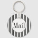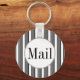 A keychain for your mailbox key with block letters on a background of black and grey stripes on white.