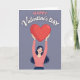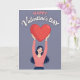 This card shows a smiling young woman from the waist up, holding a huge red heart above her head with both hands. Her head tilts back a little, her eyes are closed, and her cheeks look rosy, like she’s soaking in a happy moment. She wears a soft pink top, and the background is a muted blue-gray that keeps the focus on her and the heart. The heart is deep red with light highlights that make it look shiny and slightly 3D. At the top, the text reads “HAPPY Valentine’s DAY,” with “HAPPY” in pink simple letters and “Valentine’s DAY” in cream flowing cursive. There’s also a tiny heart used in the punctuation, adding a sweet touch. It feels warm, upbeat, and full of love, making it great for a partner or a close friend 💕❤️.