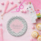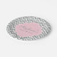 Gray and white chevron pattern with pastel pink accent baby shower paper plates. Gray and white zigzag and in the middle there is a pastel pink rectangle with your custom text.