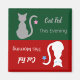 A reminder to feed the cat and let others know that the cat has been fed. Simply turn the magnet around when the cat has been fed in the morning or evening. The evening side has a grey cat with a pink star hanging from their tail. The morning side has a white cat with a blue star hanging from their tail. The background is festive green and red.