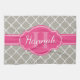 Stylish, trendy grey and white lattice pattern in the background, topped with a hot pink label featuring a customizable name and monogram template.