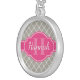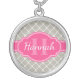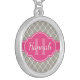 Grey White Lattice Pattern Pink Monogram Silver Plated Necklace