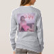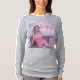This is a Wifey T-Shirt. The design was created with generative art. The artwork features an illustration of a pretty woman with blonde hair wearing a pink dress. She is sitting on a sofa at home and has a smile on her face. The word Wifey is in red cursive script above her head. The background has a patterned wallpaper. The image is on the front and back of the t-shirt. You can change the image with the Personalize button. The t-shirt is a long-sleeve grey t-shirt.