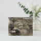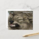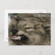 Grey Wolves with his front teeth and pink gum showing.the wolf yellow eye looking at you with one ear up and one ear down this post card has the text what`s for dinner on the front you can change the text to what you want it to be.