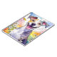 A digital art image of a Greyhound dog with a big smile sits among daisy flowers under a vibrant sky filled with colorful splashes. The background features a blend of blue, pink, and yellow hues, creating a joyful and whimsical scene.