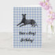A birthday card for anyone who loves greyhounds! This card features a gorgeous black greyhound with a blue gingham background. The messages are customisable so you can make them your own.