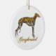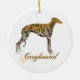 Red brindle greyhound on ceramic Christmas ornament with "Greyhound" text.