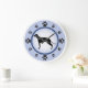 Dog owners and dog lovers will enjoy this fun modern design featuring a Greyhound silhouette and paw prints representing the numbers on the clock face, with a background of blue and a darker blue ring.