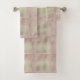 The original pattern by HomeWare on this Bath Towel Set is exactly what it’s called, a grid pattern made from an original photograph of the back of a chair. Dark gray and brown square dots in rows form the grid. The rows curve slightly as the chair does. Up close, the little square dots are holes with rounded corners and a shadow dimension around the upper and right hand edges. The colors of the body of the chair are muted, neutral tones, pale sage green blending into pale mauve, then soft, sandy brown, looking as if they have been painted on. This abstract design, with its sophisticated color scheme, has a very modern look.