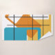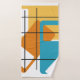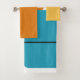 This towel set has a gold washcloth, an orange hand towel, and a bath towel with a mid-century modern design of three rectangles, orange, green, and turquoise, with a white rectangle inside each. If you like the design but prefer different colors, message me.