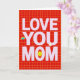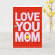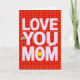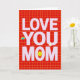 This card features the words “LOVE YOU MOM” centered in three stacked lines, set in pale lavender-white capital letters that stand out with a gentle, affectionate glow ❤️. Behind the message, a rich red background is covered with a neat grid of thin golden-orange lines, giving the scene a lively, upbeat structure. The strong contrast between the soft lettering and the crisp grid feels like a warm hug set against a festive backdrop. Near the left side of the middle line, a small curved arc in multiple colors adds a sweet, friendly touch, like a little shared inside joke between loved ones. Close by, a pale yellow starburst shape pops outward, like a tiny celebration happening right next to the words. In the last word, a rounded letter contains a simple sun-like face that seems to smile back, adding an extra dose of closeness 🌼. The text stays firmly in the center while the decorative accents cluster around it, keeping the focus on the message. The red field is evenly patterned with golden-orange grid lines, with the rainbow arc and yellow starburst sitting near the left of the middle line and the smiling sun-face tucked inside a letter in “MOM.”