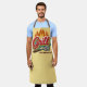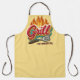 Faux embroidery style on this kitchen apron for a man food chef, grill or grilling cook featuring a spatula and flaming fire or flames, personalized with your text, perfect for looking gorgeous when cooking in the kitchen or at the grill.