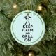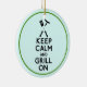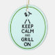 Round ceramic ornament with an image, on both sides, of the phrase “Keep Calm and Grill On” in bold black letters topped with barbecue utensils and a hot dog on aqua. Green border. See the entire Father’s Day Ornament collection in the SPECIAL TOUCHES | Party Favors section.