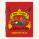 Barbeque grill over flaming charcoal, scroll banner with custom text over crossed tongs and brush.