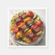 A tantalizing close-up of grilled meat and vegetable skewers arranged artfully on a white plate. The skewers feature succulent chunks of meat interspersed with vibrant bell peppers, onions, zucchini, and juicy cherry tomatoes, all glistening with a light glaze. The plate is dusted with herbs and spices, hinting at the delicious flavors within.