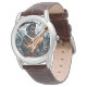 The watch looks really great! Very sharp and well done. The leather band is really nice, though for a man's watch I think it should be longer. Unfortunately, it isn't big enough for my husband's wrist but I will get a replacement because he is very excited to wear it!