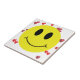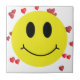 Grinning face surrounded by red hearts placed on a ceramic tile.