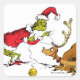 This hilarious illustration captures the precise moment the Grinch decides his dog needs an upgrade! The Grinch, dressed in his full, fuzzy Santa suit, is meticulously tying a single reindeer antler onto the head of his dog, Max, using a piece of string or yarn. Poor Max looks utterly resigned to his fate as the "reluctant reindeer." This fun, classic illustration perfectly highlights the absurd and mischievous planning behind the famous Christmas heist!