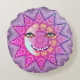 Two sides of the same pillow: one is shiny orange yellow another is purple and mauve. Star / Sun geometric pattern. Same smiling or grinning celestial face! Something truly unique and arty. A BIT WEIRD. By Alexandra Cook aka Linandara (me).