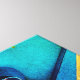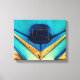 A grunged up artistic image created from a color photograph showing the chrome emblem on a muscle car. V8 power! Shades of blue and pale yellow with gritty detail, wrapping around all the edges of the canvas.