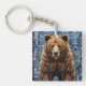 Vibrant artwork depicting a bear with a rich, textured fur coat, set against a patchwork background featuring blue and gray tones. The bear stands imposing and lifelike, capturing attention with its realistic features.