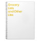 A brutally honest spiral notebook with yellow text on a white background: “Grocery Lists and Other Lies”. Ideal for writing down everything you’ll forget—or ignore—at the shop anyway.