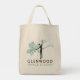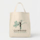 The Glenwood Dance Studio logo has black letters and a black central figure to stand out on light backgrounds, like on this grocery tote bag with the logo on both sides.