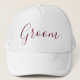 An awesome calligraphy design for a groom, this white trucker hat is perfect for you. "Groom" is written across the front using cursive burgunday font. Place your order today!