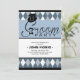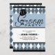 Get the gentlemen together for an evening of debauchery and fun with this classic invitation. The card features the word "Groom" sporting a mustache and top hat against a men's diamond pattern.