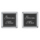 Groomsman cufflinks shown in silver plated and black onyx color with white text. Customize this item and choose from more colors and styles or buy as is.