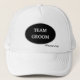 This fun hat shows a black and silver oval with the words "Team Groom"- it is personalized with your Groomsmen's name! Makes a perfect addition to your bachelor party or Wedding Day! To see matching bride hat or other super neat products-Please visit my store- "The Hungarican Princess" at www.zazzle.com./hungaricanprincess*