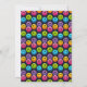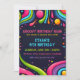 A vibrant and playful birthday invitation featuring a psychedelic, retro-inspired design. The dark background is decorated with colorful, swirling shapes, abstract lines, and vibrant drips of color reminiscent of the 1970s. The border is a fun pattern of multicolored smiley faces, with stars and bubbles scattered throughout the design. The text is in a mix of bold and playful fonts, with key details highlighted in bright blue and pink.