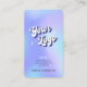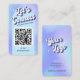 Retro QR Code business card with blue and purple gradient background and groovy fonts. These trendy social media business cards include space for your logo, scannable QR code and contact details. This holographic style design can suit any professional such as nails tech, aesthetician, makeup artist and more! Easily promote your instagram, tiktok, facebook or any other social media with these scannable QR code business cards with nostalgic font.