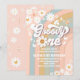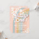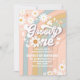 Celebrate your little ones milestone with this retro groovy first birthday invitation! Featuring pastel rainbow stripes, playful daisies, peace signs, hearts, and stars, this design captures the fun-loving 70s vibe. Perfect for a boho or retro-themed party, this customizable invite makes it easy to share all the important details with family and friends. A stylish and cheerful way to set the tone for a day full of peace, love, and fun!