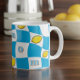 Groovy 70s mug with vibrant distorted checkerboard and lemons design. Featuring a playful pattern of sunny sky blue and crisp white squares, interspersed with fun lemon motifs, this mug is a perfect nod to the kitsch kitchen aesthetic of the era. Its retro charm makes it an ideal addition to your morning coffee ritual or a delightful accent piece of dopamine decor for your home. Enjoy a touch of nostalgic fun with every sip. Mom is editable for short names or initials.