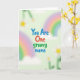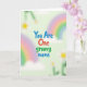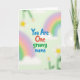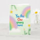 This card features a centered message that reads “You Are One groovy mama,” set in rounded, easy-to-read letters that feel friendly and affectionate ❤️. “You Are” and “mama” are colored in bright blue, “One” is warm red, and “groovy” is a cheerful green, with the words stacked neatly in the middle. The background is a pale mint green that keeps everything light and calm, like a soft daytime sky. Two pastel rainbow-like arcs curve in from the upper edges toward the wording, gently framing it like an embracing gesture. Around the text, daisy-like flowers appear in a slightly blurred style, with white petals and golden centers that add a sweet, caring tone 🌼. Thin green stems and small floral touches are scattered across the background, giving the scene a breezy meadow feel without crowding the message. The arcs are faint and airy, and the blossoms sit lightly around the center, leaving the colorful phrase as the main focal point. The mint backdrop is dotted with soft white daisies, yellow centers, and slender green stems beneath the pale arcs.