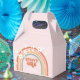 Retro inspired groovy one first birthday party favor box with hippie style rainbow, daisies and boho fonts and colors.