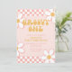 Groovy Girl Retro inspired 1st birthday invitation with 70's style fonts and daisies and checker pattern.